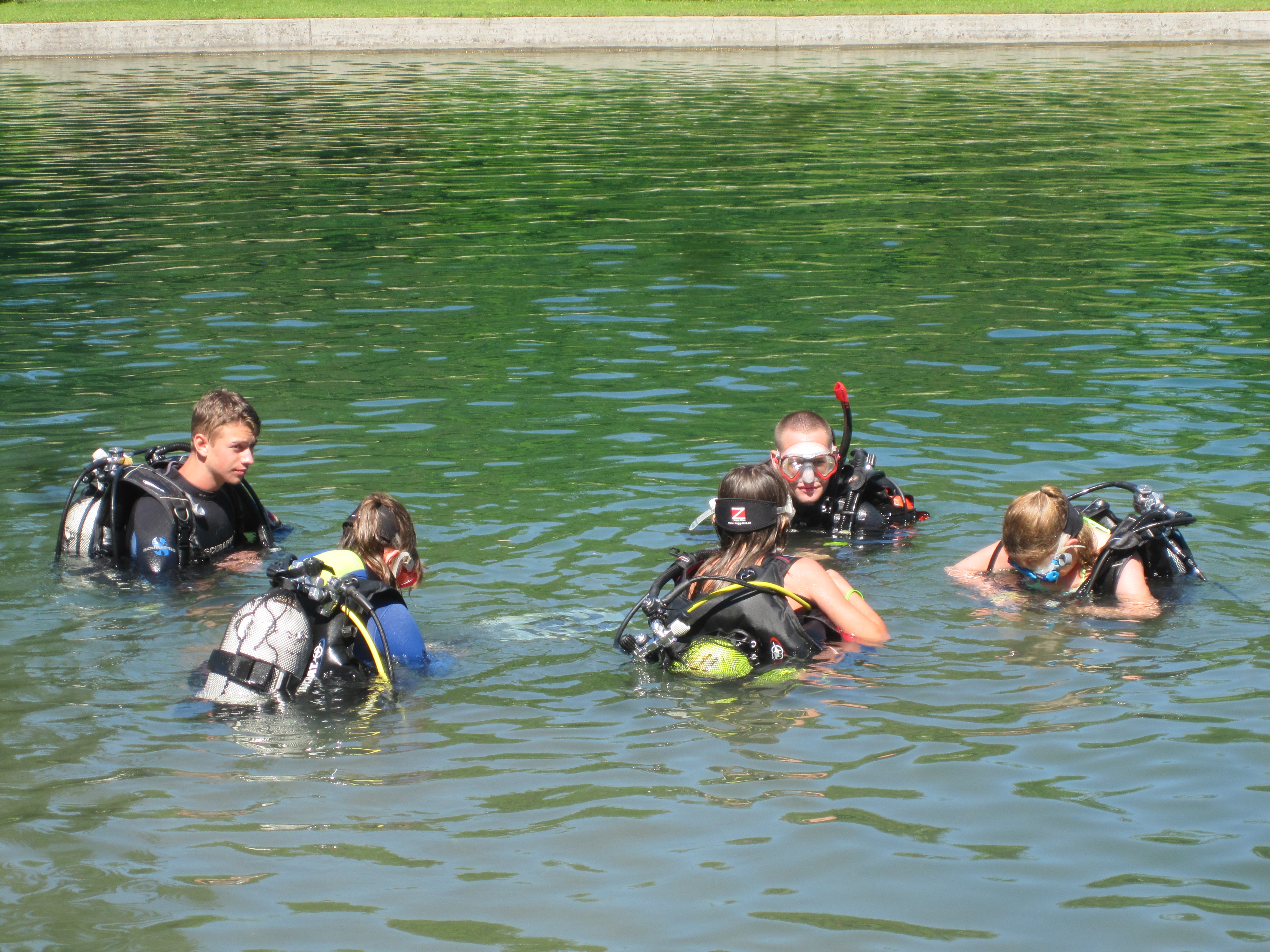 Das WWF-Tauchlager zusammen mit der Zingg-Dive GmbH hat heute seinen vierten Tag fertig gebracht. An diesem Tag, mussten die Teilnehmer in Form von einer Stafette in verschiedenen Gruppen verschiedene Übungen über und unter Wasser ausführen, wie z. B. nach einem versenkten Tarierjacket tauchen, es unter Wasser anziehen und damit wieder an die Oberfläche auftauchen.