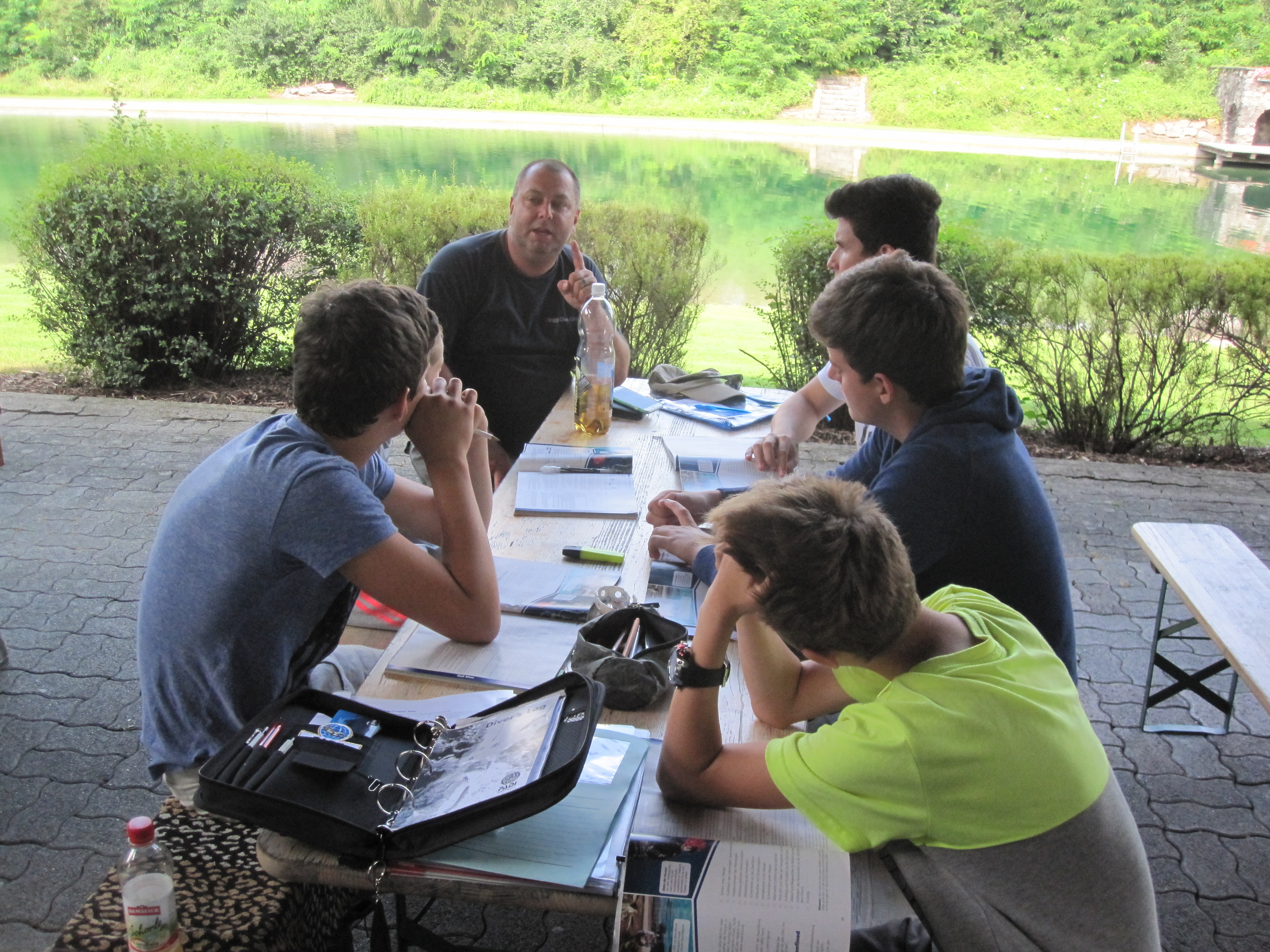 Nach dem Ausladen und dem Setzen der Boje begann der Morgen mit einer spannenden Theorielektion für die Teilnehmer. Dabei wurde die komplette Theorie des Open Water Diver Kurs besprochen, alle Fragen wurden geklärt und die Teilnehmer wurden auf die Prüfung vorbereitet.