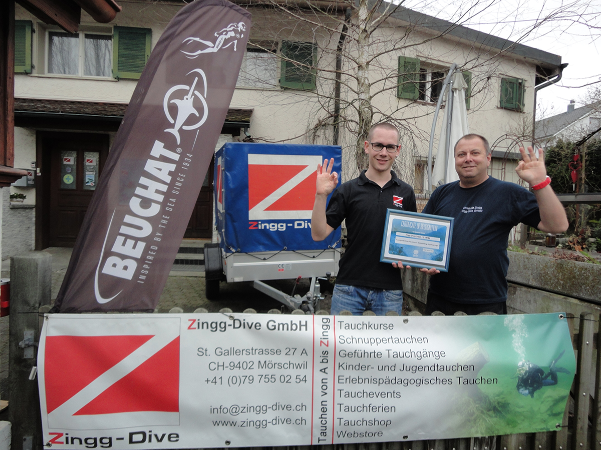 Am vergangenen Dienstag, den 31. März 2015, durfte die Zingg-Dive GmbH von PADI, der weltgrössten Organisation für Tauchausbildung, eine Auszeichnung entgegennehmen. Der PADI-Award wurde der innovativen Tauchschule unter der Leitung der Führungscrew mit Christoph Zingg, Ivo Schulthess, Philippe Braun, Simo Simic und Christian Engler für besondere Leistungen in der Aus- und Weiterbildung von Tauchern verlieren. Der verantwortliche PADI Gebietsleiter Sascha Engler lobte bei der Übergabe die innovative Geschäftsidee der jungen Crew und betonte die Wichtigkeit von Jugendarbeit im Rahmen der Prävention. „Die Zingg-Dive GmbH setzt Massstäbe bezüglich Qualität und Sicherheit in der Tauchausbildung“, meinte Engler. Die Verantwortlichen der Zingg-Dive nahmen mit Stolz diese Auszeichnung entgegen, und hoffen auch in Zukunft viele Jugendliche zur aktiven Mitarbeit in ihrem Team motivieren, und ihre Tauchbegeisterung an lernwillige Schüler weitergeben zu können.