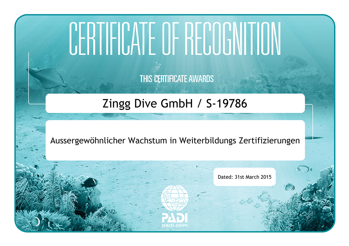 Die Zingg-Dive GmbH gewinnt den PADI-Award für aussergewöhnliches Wachstum im Bereich Weiterbildungs-Zertifizierungen